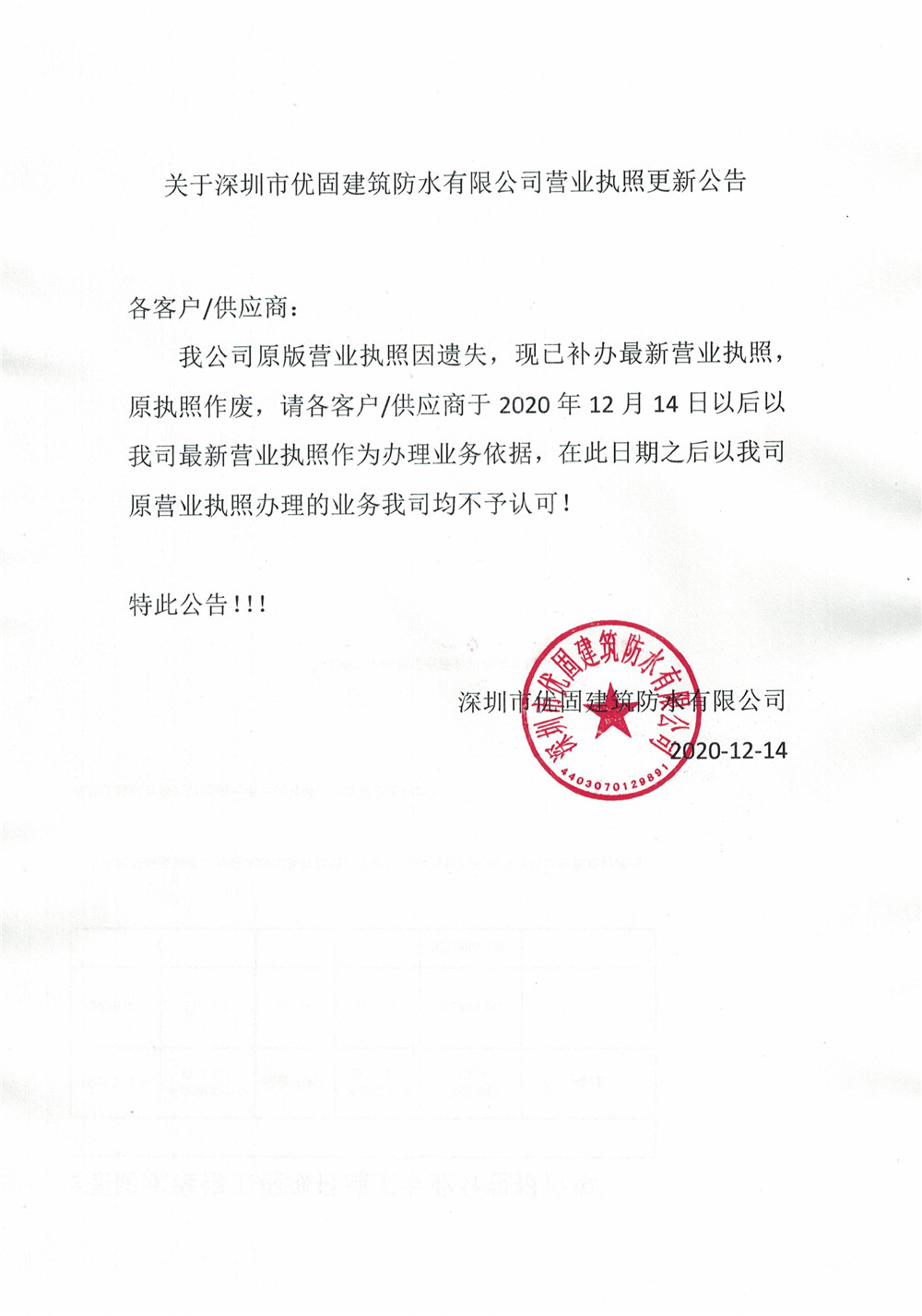 Announcement on the business license update of Shenzhen Yougu Construction Waterproof Co., Ltd.
